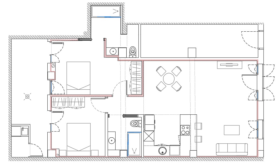 En el plano reformado se aprecia una propuesta más clara y coherente, donde las circulaciones se ordenan y los espacios ganan amplitud y luz. Se eliminan barreras innecesarias, se optimizan los usos y se crea una distribución más cómoda, pensada para el día a día de la vivienda.